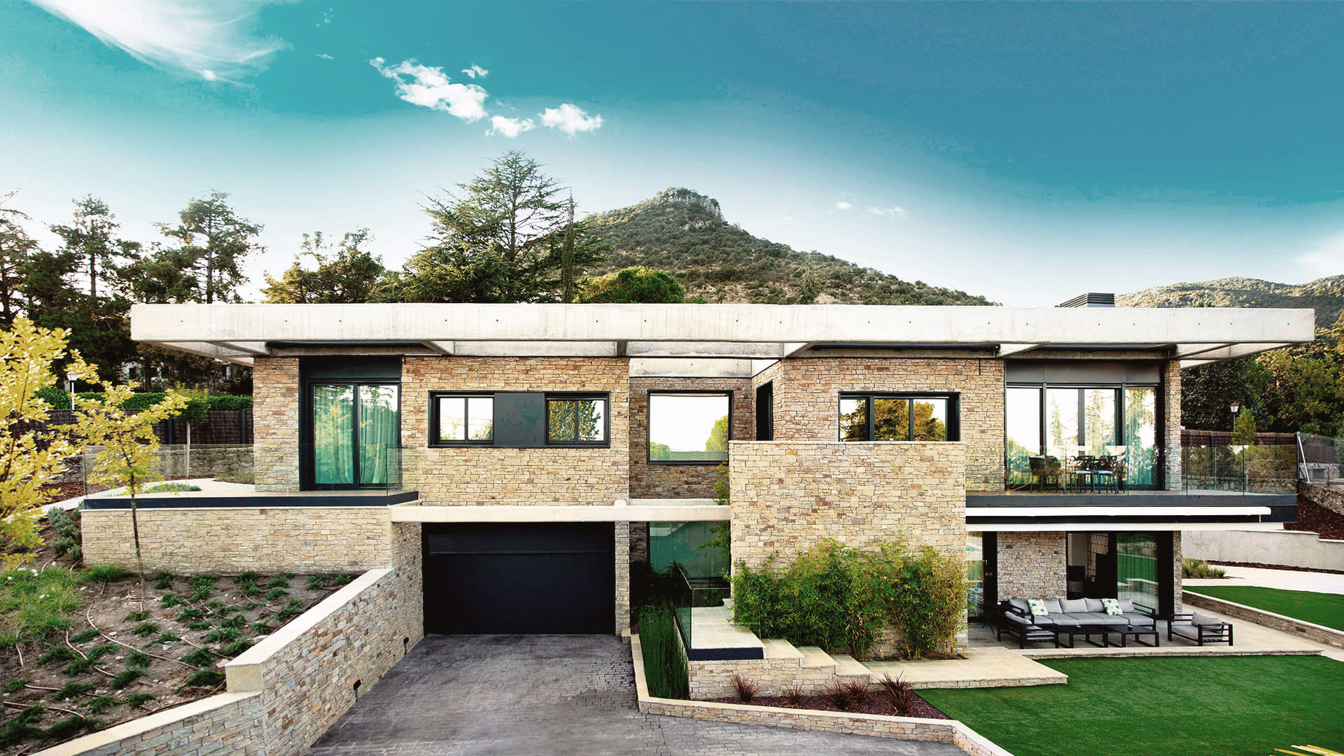 El volumen de piedra frente a la vivienda rompe con la linealidad generando planos con distinta profundidad sin consumir ocupación de parcela agotada por la vivienda, pero sí aumentando el volumen visual de la edificación. Estos muros ocultan la escalera exterior que conecta la vivienda habitual situada íntegramente en la planta superior con las zonas ajardinadas y de piscina.
