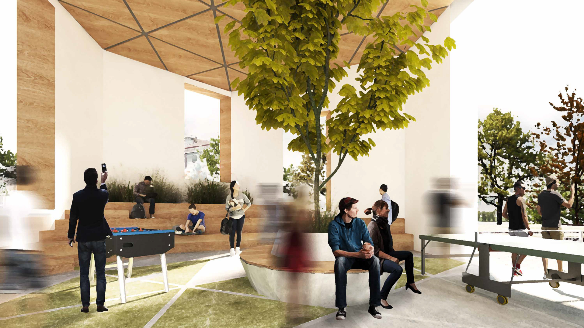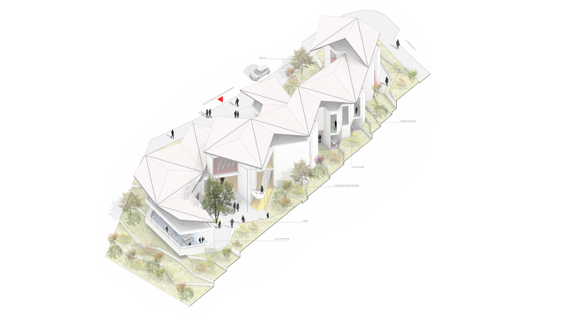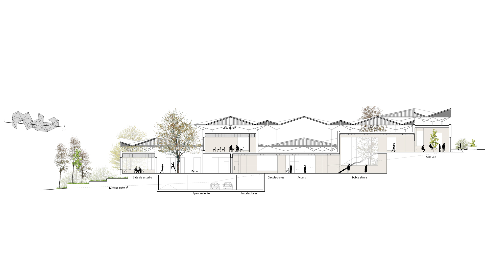 Por ello la cubierta de este proyecto no es sólo una herramienta bioclimática sino que también es un elemento transmisor de conceptos como cobijo, ligereza, creatividad, grandeza, etc … pero sin duda teniendo en cuenta uno de los colectivos a quien va dirigido, personas con riesgo de exclusión social, la cubierta trata de transmitir la sensación de apertura al mundo frente a un edificio convencional.